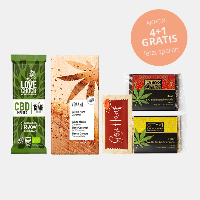 Bundle enthält: 2 x Vivani Weiße Hanf Caramel Schokolade, Lovechock CBD Schokolade und STYX Bio Weiss und STYX Edelbitter bestreut mit Hanfsamen