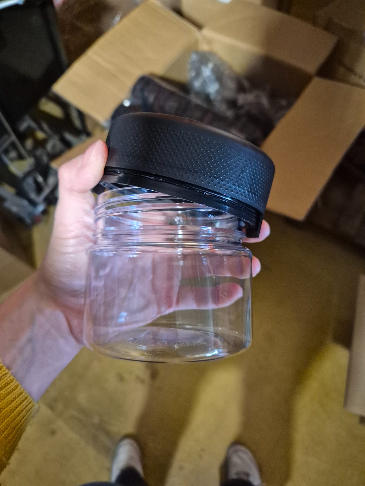 Chubby Gorilla Stash Container (CGSU) aus klarem Kunststoff. Kindersicherer schwarzer Push-Down-and-Turn Schraubdeckel. Geruchsdichte Aufbewahrung fuer Bluete oder Kraeuter.