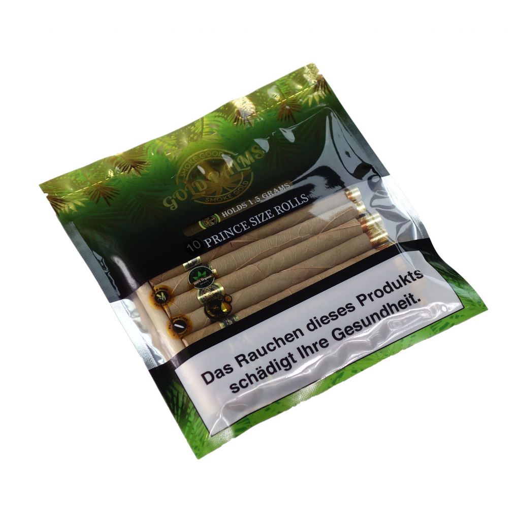 Gold Palms Prince Size Blunt Rolls – handgerollte Blunts aus ostindischen Tendu-Baumblaettern. 100% biologisch, tabakfrei, holzig-fruchtiger Geschmack. Jeder Blunt inkl. Corn-Husk-Filter und Fuellstab. Fuellmenge ca. 1,5g pro Blunt, ca. 110mm Laenge. 10 Packungen.