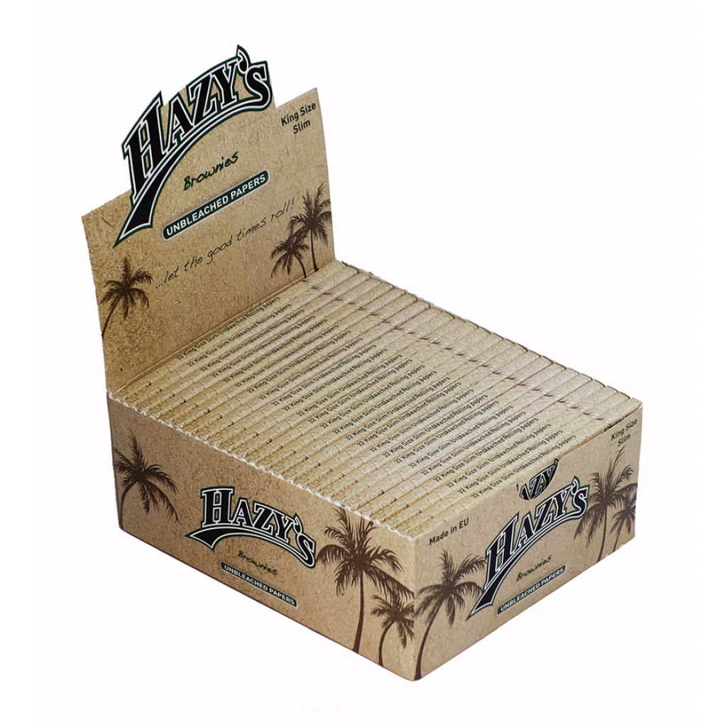 Hazy’s Brownies King Size Slim Papers in natuerlicher, ungebleichter Qualitaet. Ultra-duenne, braune Papers mit 32 Blaettchen pro Heft. Format: ca. 110 x 44 mm.