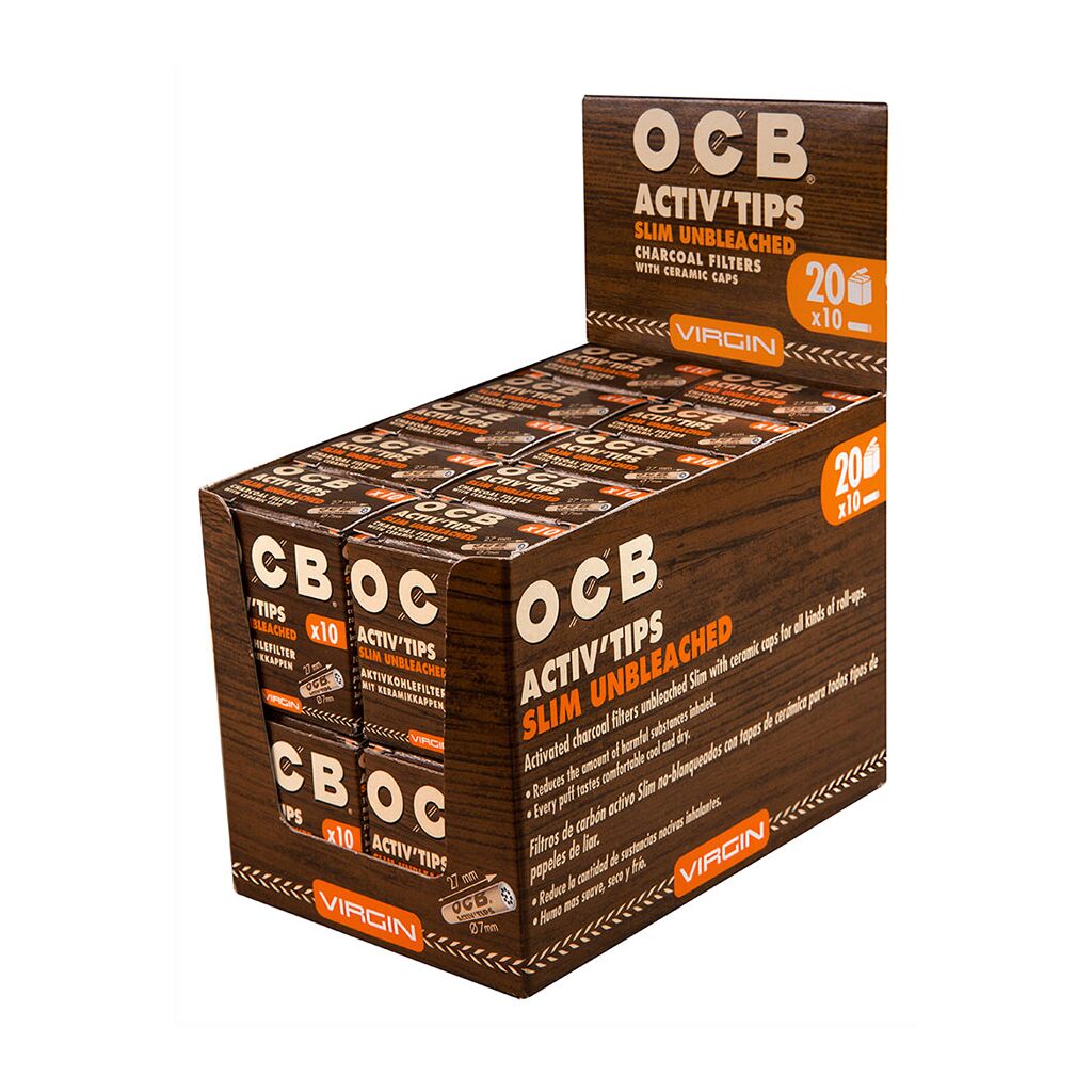 OCB Virgin ActivTips Slim – ungebleichte Aktivkohlefilter mit Keramikkappen an beiden Seiten. Koennen beidseitig eingedreht werden. Made in Germany. 7 x 27mm, 10 Filter pro Packung.